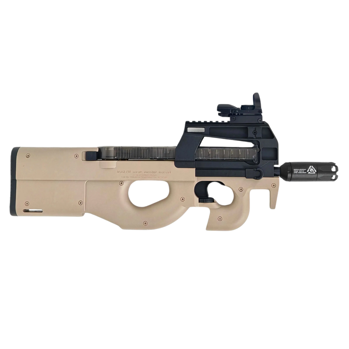 Dominera fältet med vår elektriska full-auto P90 utrustad med en metall LED-spårare för spårkulor (spektakulär ljuseffekt) och ett inkluderat sikte för snabb och exakt sikte. Chassi i högstyrkenylon, hög eldhastighet, premiumkänsla.